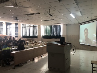 这学期丁老师受国家留学基金委资助去加拿大访学一年。丁老师虽身在异乡,但仍心系学生。平时,丁老师会通过微信、QQ等实时通讯工具了解班级动态,关注我们的学习情况。临近期末,丁老师想给大家加油鼓劲,让大家专心备考;同时,强调考试纪律,做到诚信考试,我们筹划了本次班会。我们和丁老师有14个小时的时差,经过多次协调终于在24日上午找到合适的多媒体教室,与丁老师实现了跨洋视频通话,开了这次跨越时空的特殊班会,