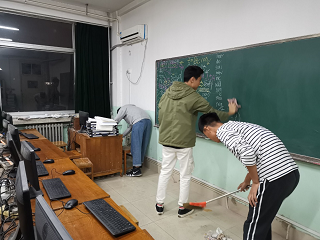 经过短暂而明确的分工之后,党支部成员成员们纷纷投入到自己所负责的任务中去。拿起扫把、抹布,认真清扫地面,擦净黑板和玻璃,一丝不苟的打扫着每一个角落,力争不放过每一个可以藏污纳垢的地方。