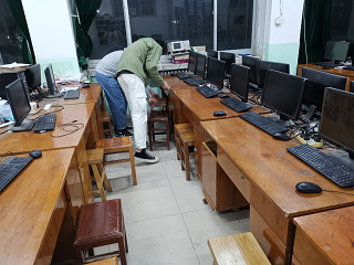 清扫完地面后,看到上课用的凳子比较乱,党支部成员们又干净利索地摆好凳子。同时,党支部成员们还和实验室同学一起检查了实验室安全用电、排查了实验室安全隐患。