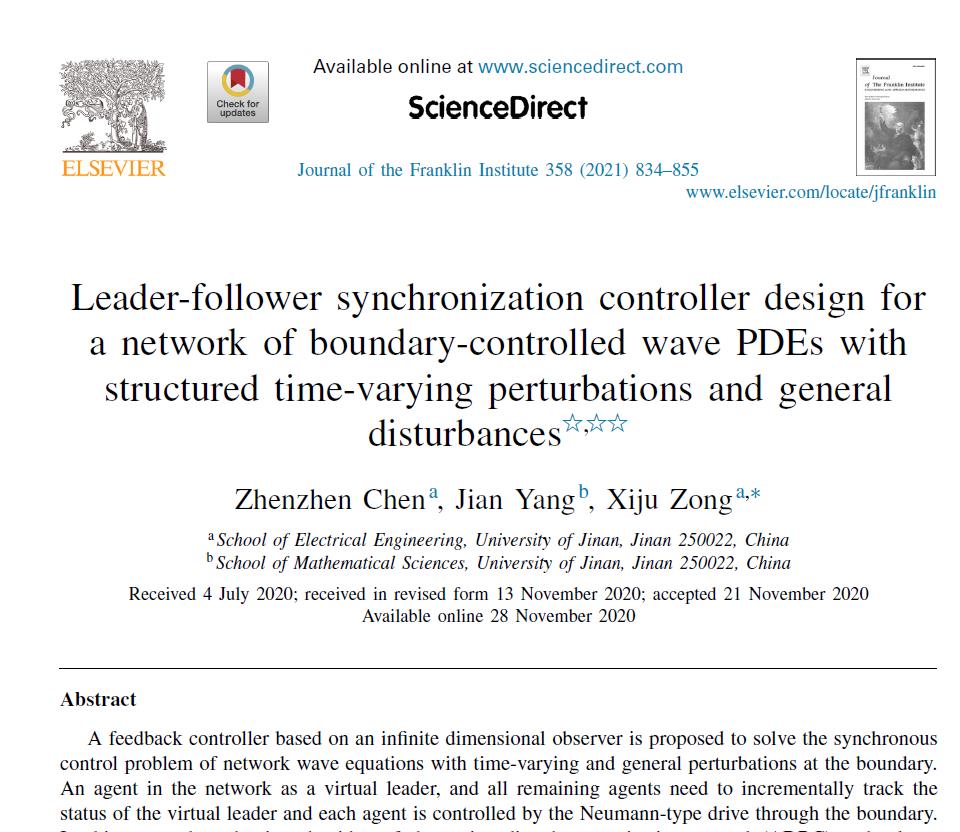 在读硕士研究生陈镇镇同学撰写的论文“Leader-follower synchronization controller design for a network of boundary-controlled wave PDEs with structured time-varying perturbations and general disturbances”在Journal of Franklin Institute(《富兰克林研究所杂志》)发表,正式出版是2021年 第一期,第358卷, 834-855。