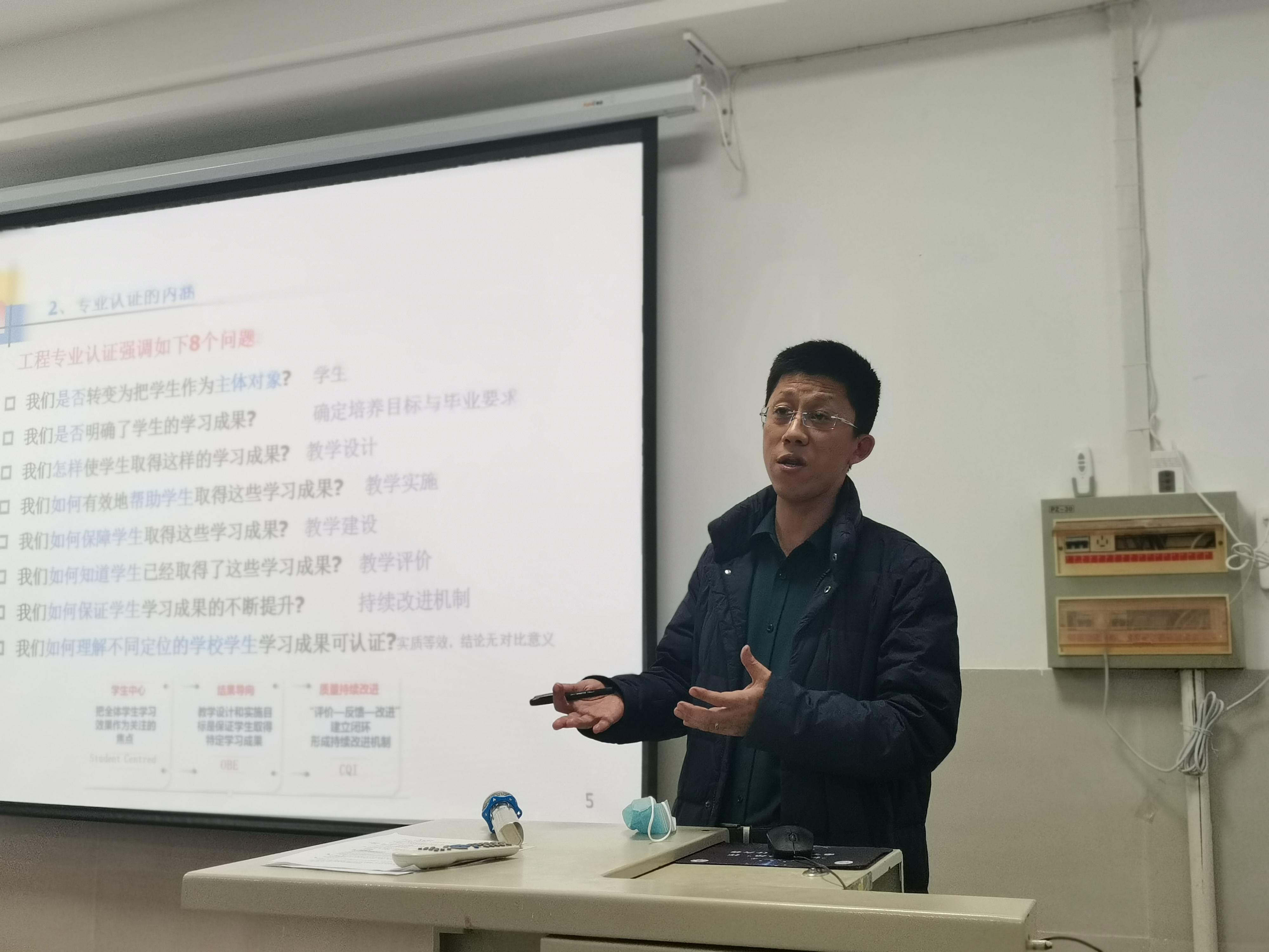 随后,自动化专业认证工作小组张强副教授就专业认证内涵、现状和近期工作安排进行了详细阐述。针对毕业要求指标分解、达成度评价、持续改进机制构建等专业认证工作的要点、重点、难点进行了认真梳理分析;说明了教学档案归档工作的重要性。