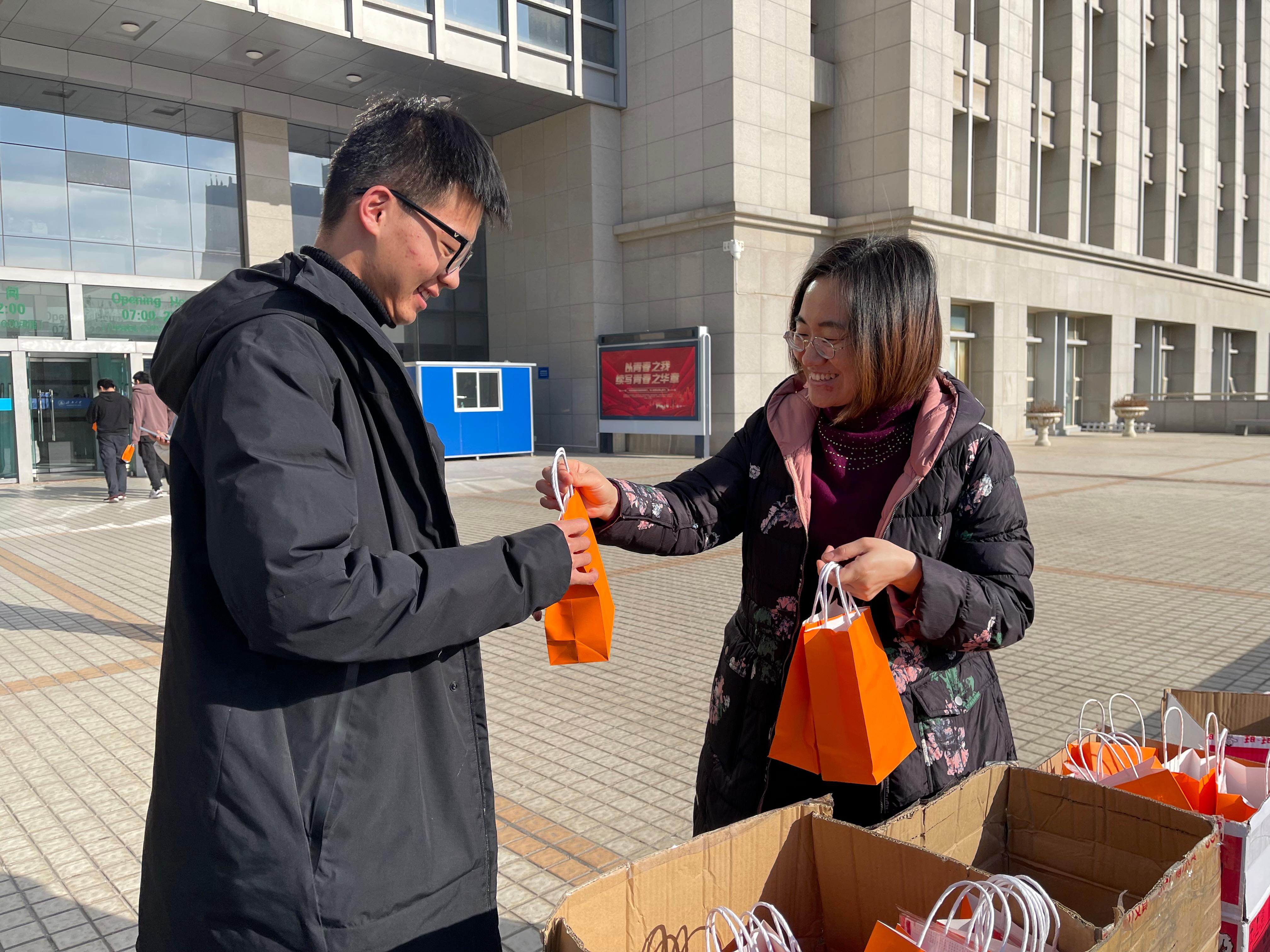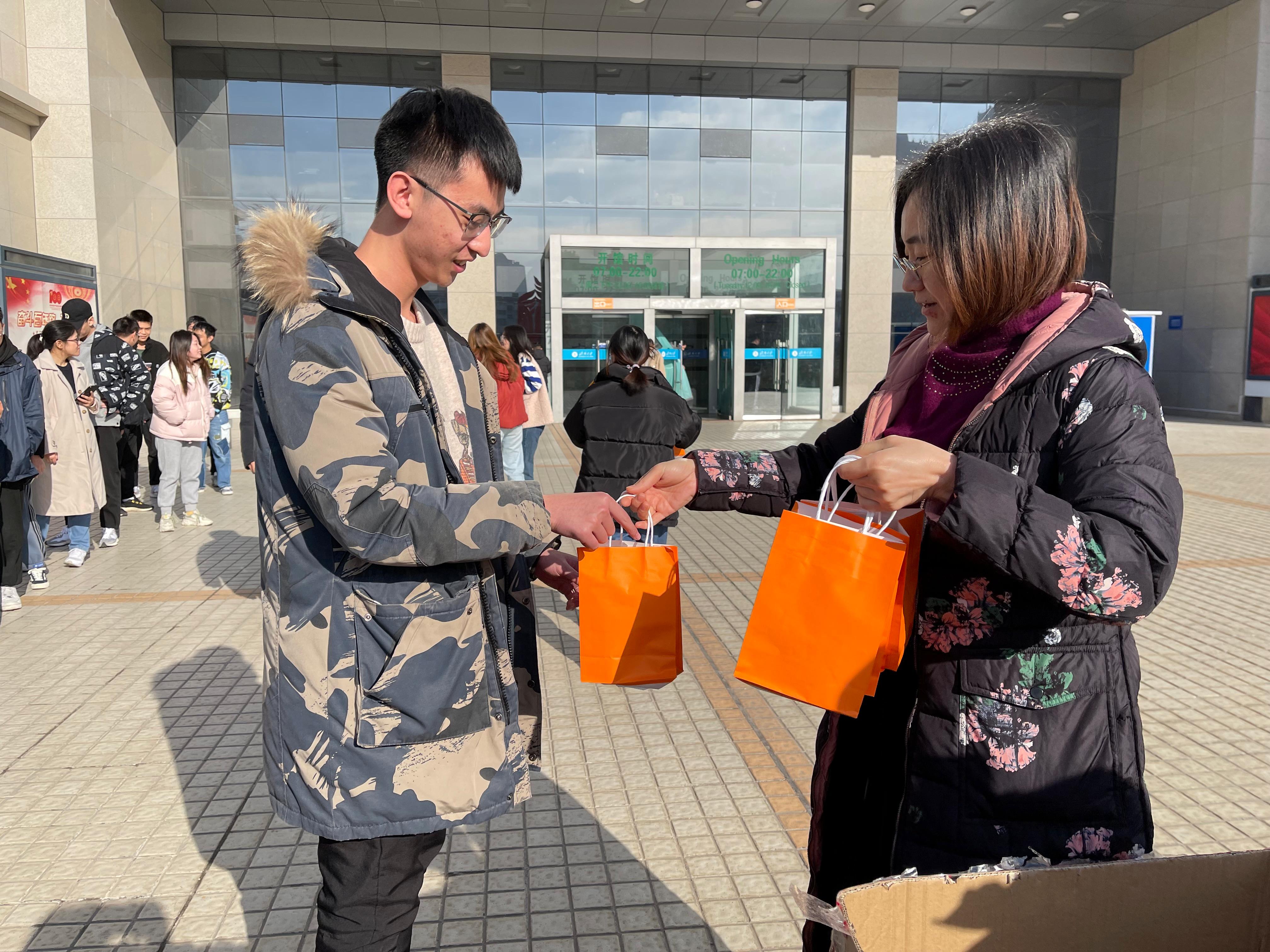 为同学们赠送了“考研大礼包”,中国红口罩寓意“红红火火”,旺仔牛奶寓意“诸事旺旺”,棒棒糖寓意“棒上加棒”,定制书签上印有打印准考证时间、考试时间等考试相关信息,提醒同学们不要忘记关键时间节点。