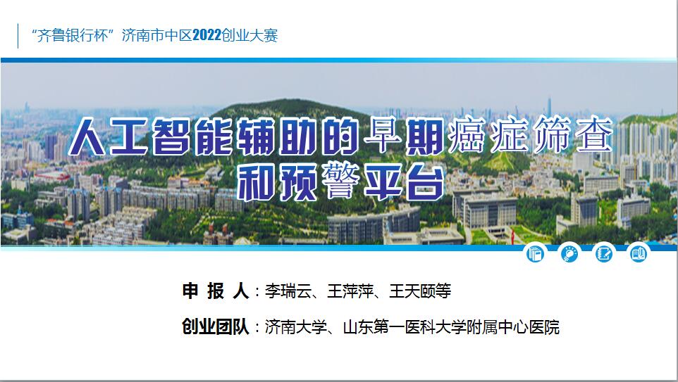 经过激烈的角逐,麻豆av学生李瑞云及其团队的《人工智能辅助的早期癌症筛查和预警平台》项目获得大赛青年创意组一等奖并获得济南市市中区的创业扶持资金奖励。
