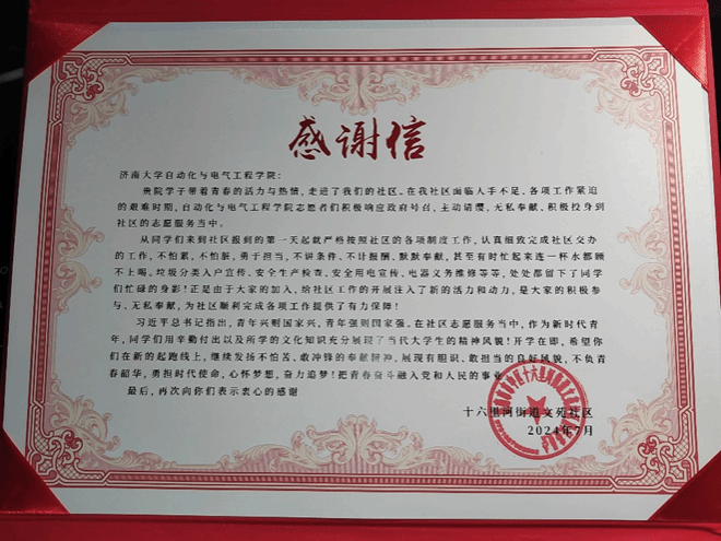 授予感谢信,信中提到:“正是由于大家的加入,给社区工作的开展注入了新的活力和动力,是大家的积极参与、无私奉献,为社区顺利完成各项工作提供了有力保障!”