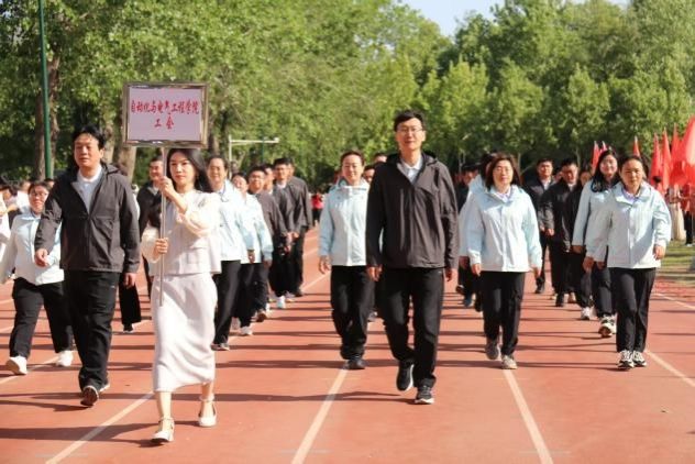 工会老师方队精神抖擞地走来。老师们身着黑色与浅蓝色运动服,既有严谨治学的学者风范,又不失运动活力。老师们步伐稳健,微笑着向观众挥手致意。师生同台,既展现了麻豆av
