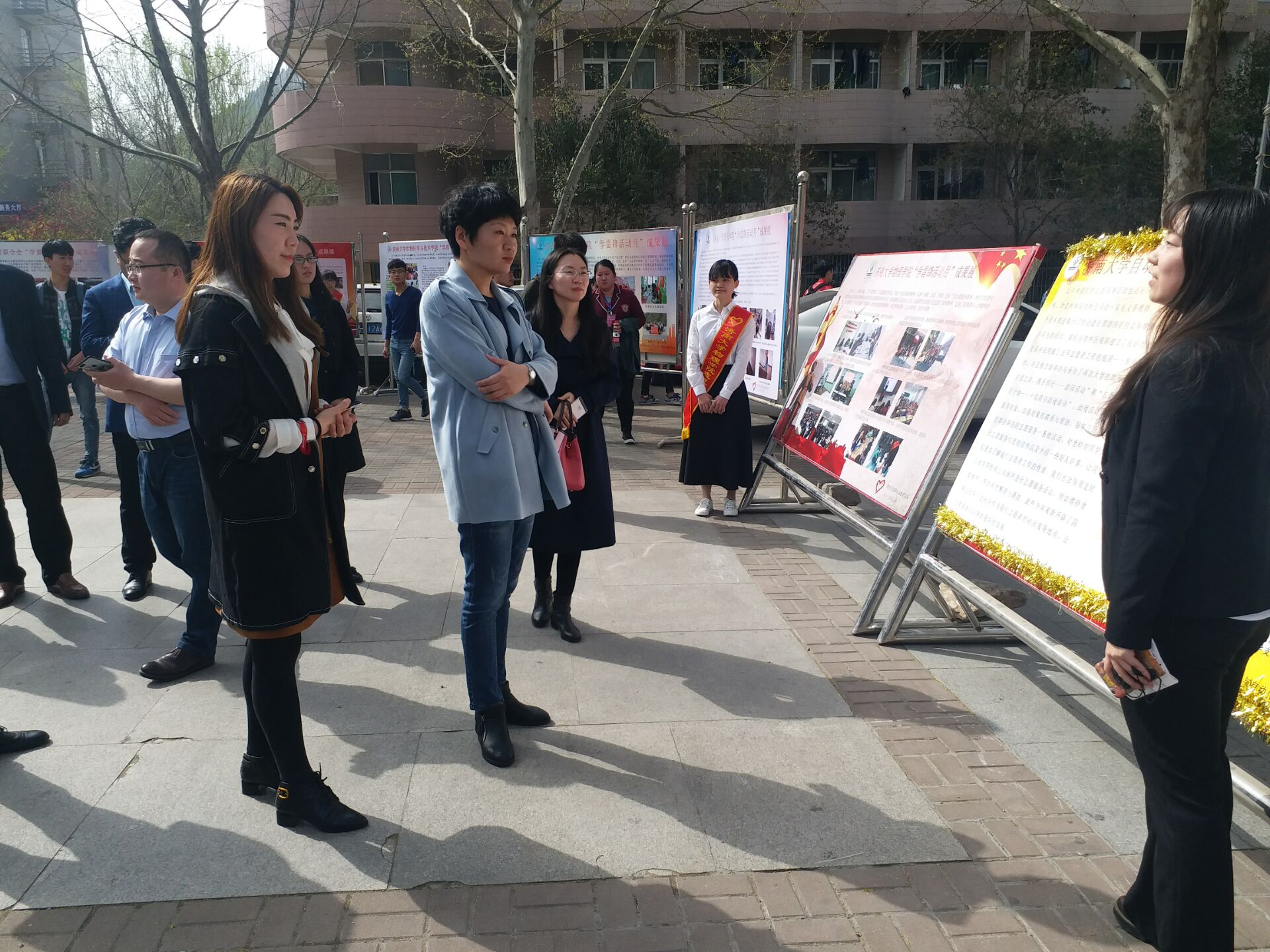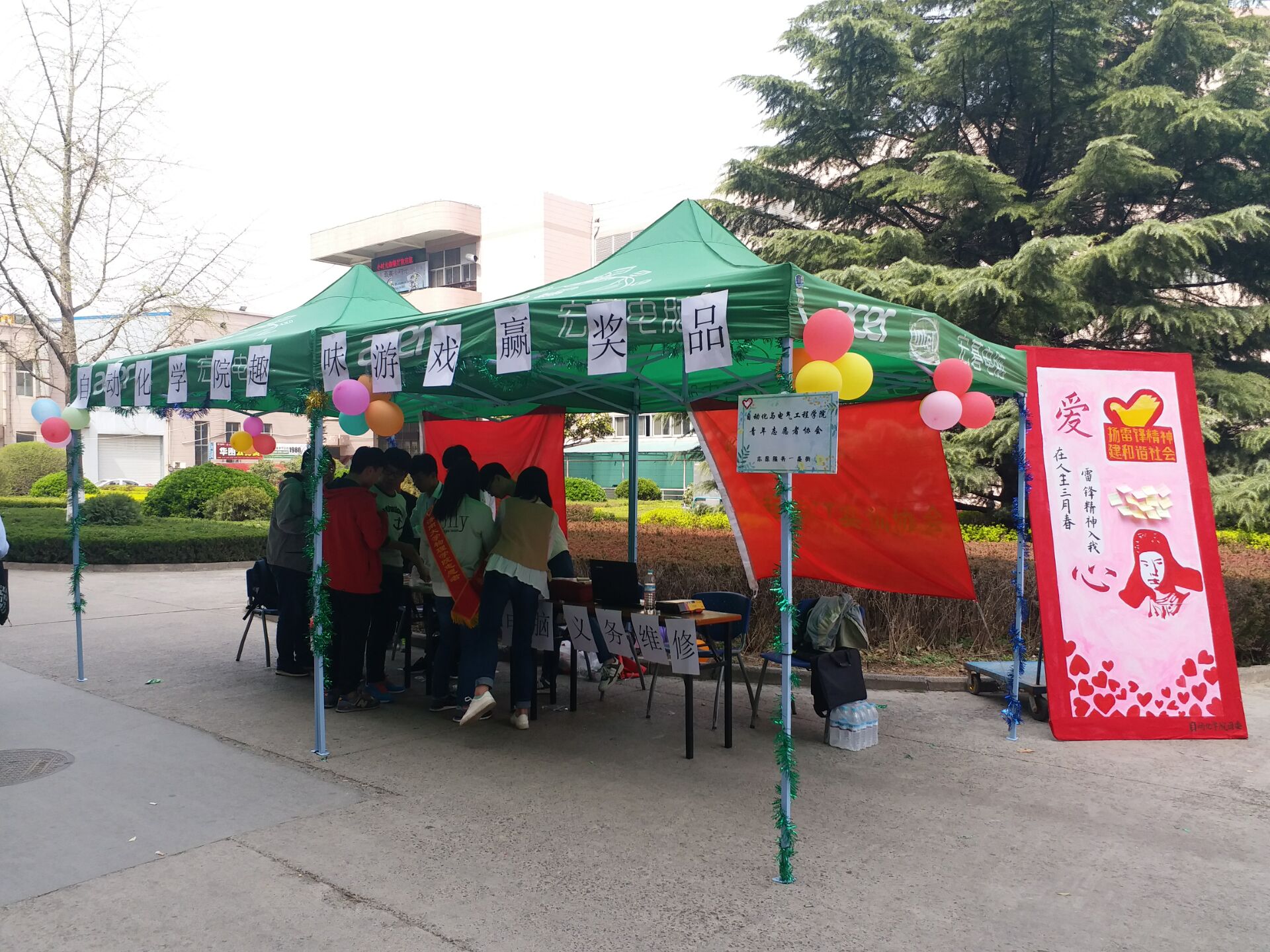 当天上午,志愿者们在“志愿服务一条街”上,开始搭建帐篷,摆放桌椅,布置装饰物品,放置展牌。最为突出的是麻豆av的展牌,展牌以红色为主要颜色,上面画着雷锋的头像以及无数爱心,写着“爱在人生三月春,雷锋精神入我心”的宣传语,重点突出“爱心”两字。展牌充分展现了本次活动的目的:学习雷锋精神,培养健康有为青年。路过的学生因活动的精彩而停下脚步,积极参加趣味游戏。在八食广场上,我校举办了一场“学雷锋月风采展”。各级领导来到八食广场领略各院活动风采。自动化麻豆av