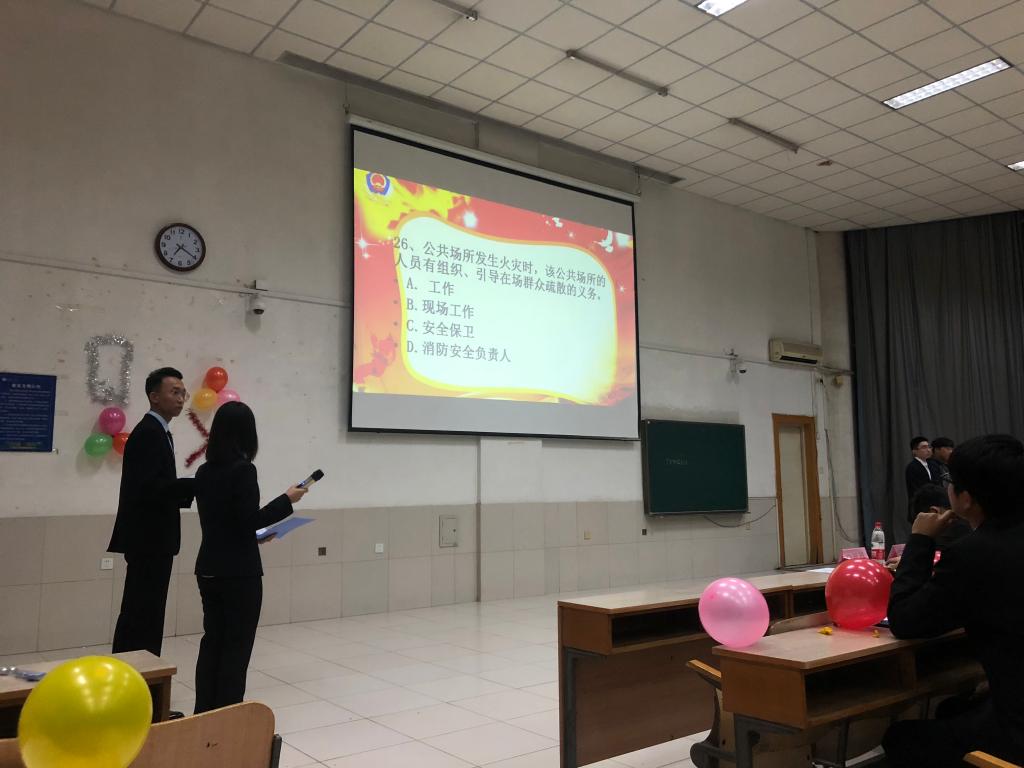 学生自发组成的14个战队依次进行答题,大家在答题的过程中不仅是得分,更是掌握了基本的消防知识,可谓是一举两得。在活动脑力的过程中也是进行了小游戏,大家积极上前进行夹乒乓球的活动。比赛氛围一度活跃,队员们热情越来越高涨,活动如火如荼地进行。之后开始了第二环节抢答题,根据大屏幕上的电话号码打电话来进行抢答,第14战队可以说是这个环节的最大赢家,抢答的速度最快,答题准确率也很高。最后是风险题,各个战队轮流进行,自己选题目答,分数越高相对应的题目难风险也大,但各个战队非常有冒险精神,大都选择难度高的题目。活动最后,计算各队分数进行奖励,此次活动圆满完成。