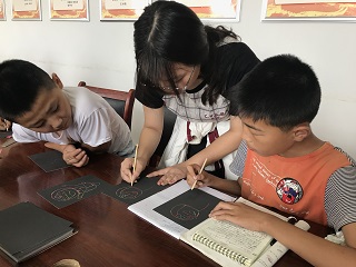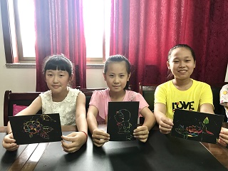 几乎所有小朋友都是第一次接触到“刮画纸”这种绘画用具,从一开始的满心好奇,再在老师的悉心教学下绘出最满意的作品。他们稚嫩的小身躯端坐在座位上,埋头认真在纸上画出一笔又一笔时,一个个梦想仿若鲜花绽放在纸上。小朋友们的绘画并非都是一帆风顺,有年纪太小的孩子在绘画过程中遇到挫折,我们便上前鼓励并为他们认真修改作品。在我们细心地教导下,一幅又一幅小作品完成了,有的小朋友更是争相将完成的作品展示给老师看,以淳朴的微笑给我们留下深深的难忘和感动。
