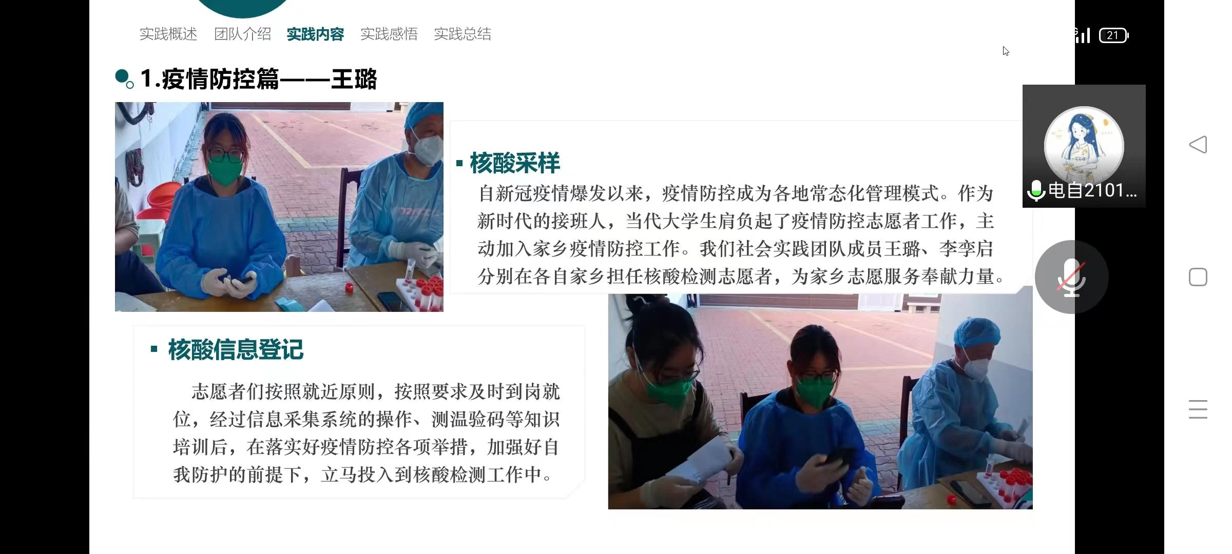 此次活动参评团队各派一名代表进行实践风采和实践成果宣讲展示,代表们通过PPT和视频全方位地展示团队实践过程以及实践成果。其中“‘电’亮爱心—青风不止,马不停蹄”实践队在以往单一宣讲防火用电安全常识的基础上,把专业知识与电力行业的红色故事相结合,通过现场讲解及互动交流,全面展示了电力行业发展的历史沿革,生动阐释了国家劳模精神和工匠精神的实质内涵。而在抗击新冠疫情方面,实践队员按照居住地就近就便原则,深入社区、农村,积极参与核酸检测、卡口设防、摸排走访等志愿服务,协助做好空巢老人、困难弱势群众及居家隔离居民的生活保障。最终“‘电’亮爱心—青风不止,马不停蹄”实践队“在实践中觅真知,在奉献中长才干”实践队“青年勇担当,乘风破浪行”实践队及“传承红色基因,继承光荣传统”实践队以内容充实、角度新颖、成果丰富等优点被评选为优秀团队。